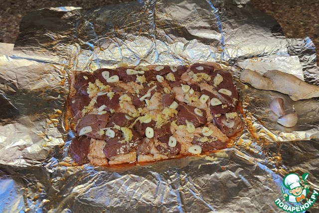Маринованное мясо выложить на фольгу, добавить чеснок (порезанный пластинами), имбирь (потертый на терке).