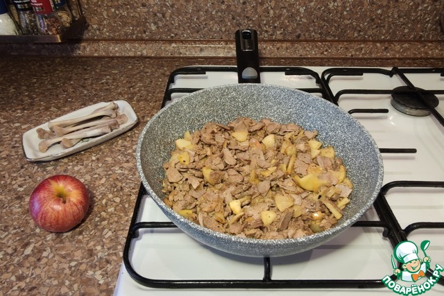 У яблок снять кожицу (по желанию), убрать сердцевину, порезать небольшими кусочками, слегка обжарить на сковороде с коричневым сахаром. Добавить мясо из духовки, перемешать.
