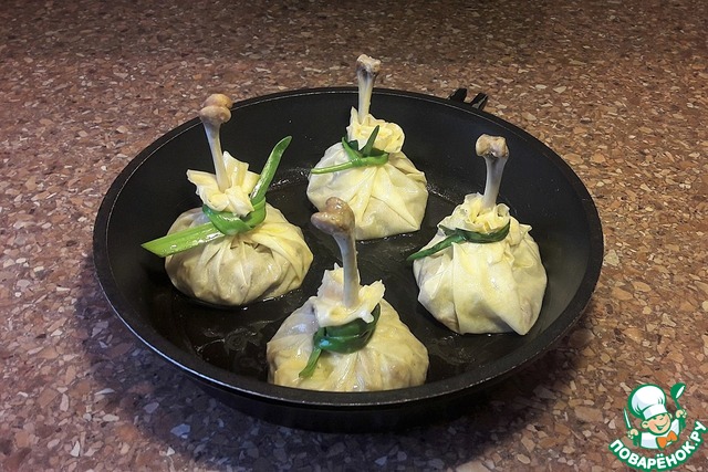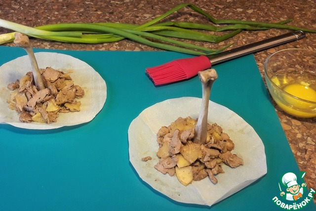 Сформировать мешочки. Завязать "мешочки" перьями зелёного лука, обмазать яйцом