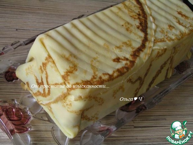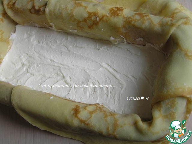 Форму для террина (23х9х5,5см) застелите 4 блинчиками так, чтобы свисали края.
