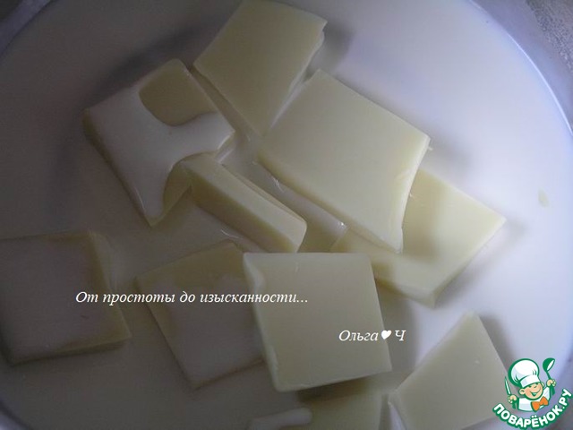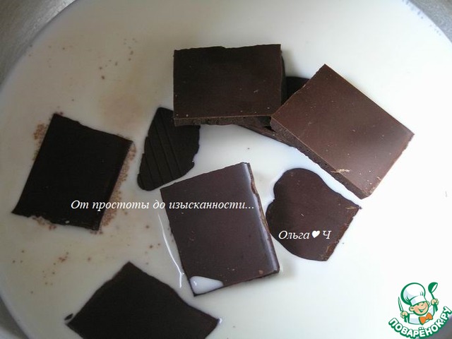 Желатин замочите в молоке до набухания. Сливки (100 мл) нагрейте, положите кусочки темного шоколада, перемешайте до однородности.