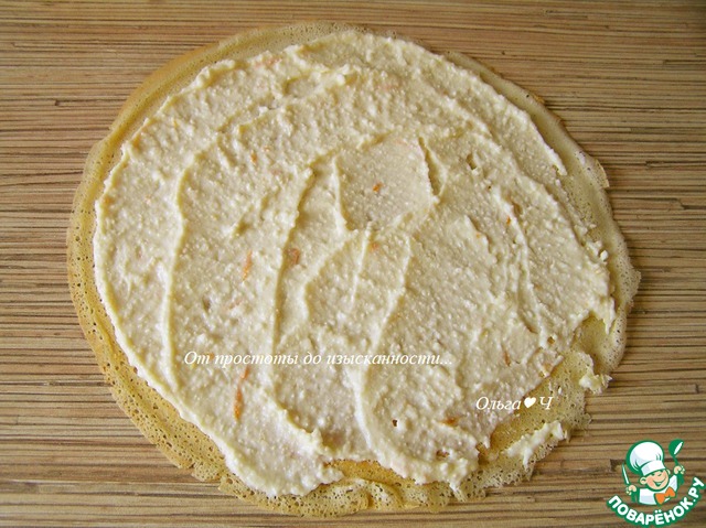 На каждый блинчик положите 1/6 часть начинки, разровняйте.