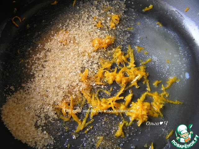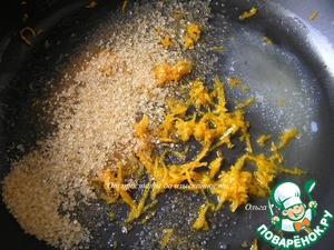 А пока приготовьте соус. Растопите сливочное масло в сковороде, добавьте растительное, всыпьте цедру и коричневый сахар, готовьте пока сахар не растает.