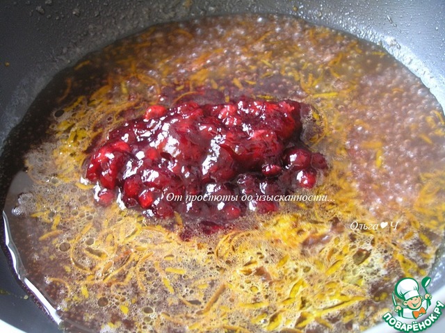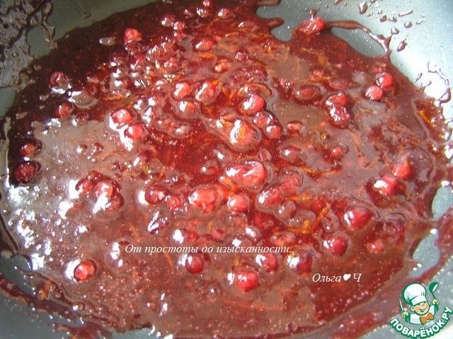 В небольшом количестве вишневого сока разведите крахмал, смешайте с остальным соком и перелейте в сковороду, нагрейте, затем добавьте брусничный соус.