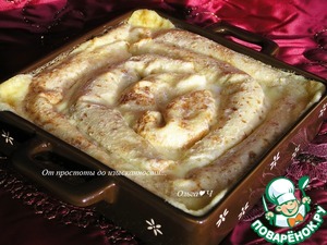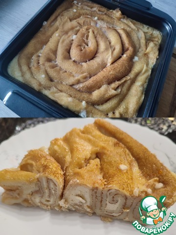 Уложите блинные рулеты в форму для запекания (у меня 20х20 см, но лучше взять круглую), смазанную маслом.