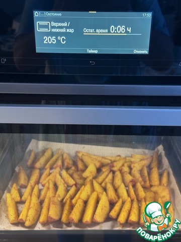 Противень в разогретую духовку. Полчаса на ста восьмидесяти градусах держал и потом минут пятнадцать на двухстах. Типа – подрумянивал.
