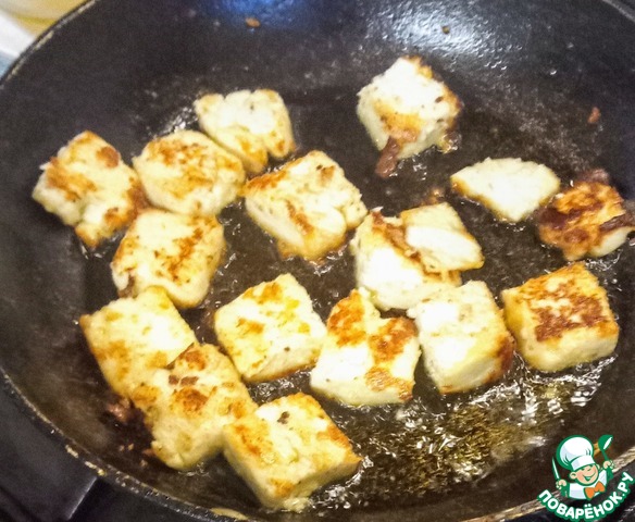 В сковороде разогреть растительное масло, добавить сыр панир и жарить его 10 минут, постоянно помешивая.