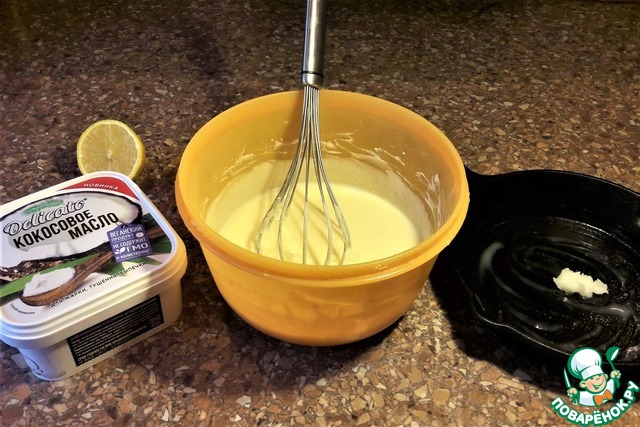 Нагреваем масло, оставляем часть для смазывания сковороды, остальное выливаем в тесто.