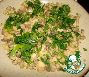 Залили майонезом, поставили в сторону пропитываться)) Мелко рубим оставшиеся шампиньоны, солим, перчим... чеснок