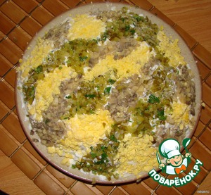 Салат я выкладываю слоями в таком порядке: Грибы (две трети маленькой банки) + Зелень петрушки + Картофель + Мясо (Кубиками) + Зеленый горошек + Майонез + Свежий огурец + Мясо + Картофель + Белок + Майонез