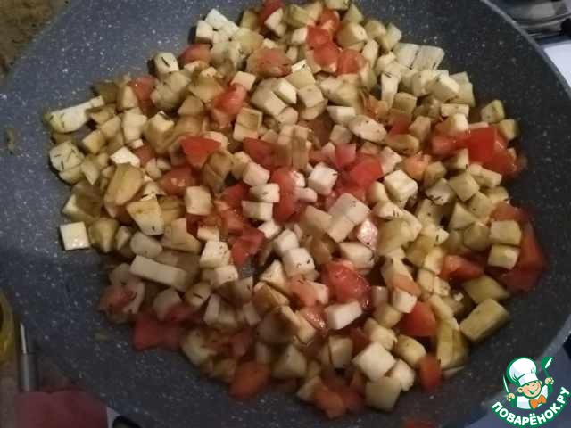 Баклажан очистить, нарезать кубиками, помидор кубиками. Обжарить овощи с добавлением соли, перца, тимьяна и сушёного чеснока до мягкости баклажана.