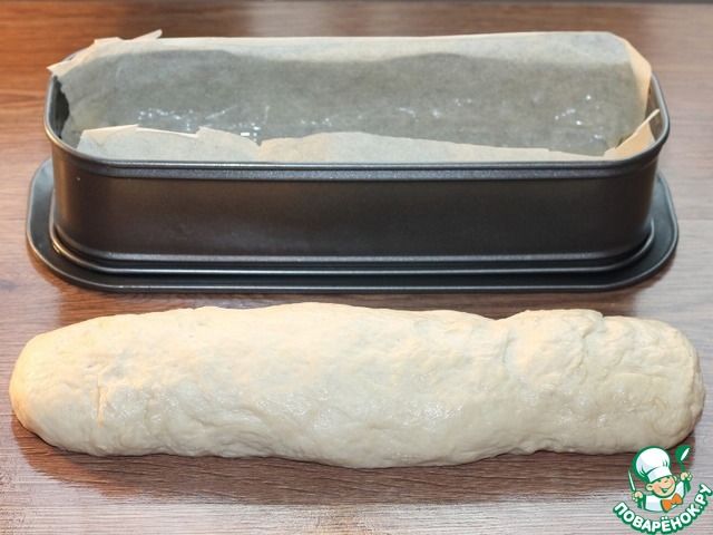 10. Форму для выпечки застилаем пергаментом и смазываем растительным маслом. Формируем из теста батон.