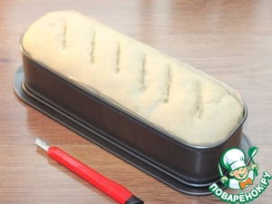 [+5]Муку не добавляла, хоть тесто и получилось жидковато, но я замешивала в хлебопечке и не увидела смысла формовать батон, если готовить всё равно в форме. Просто выложила тесто в форму силиконовой лопаткой. Надрезы тоже сделала сразу.