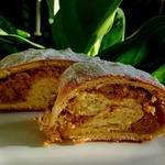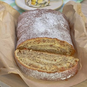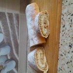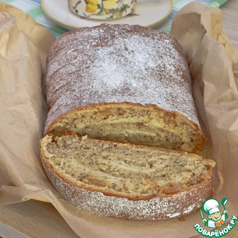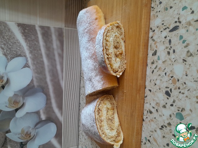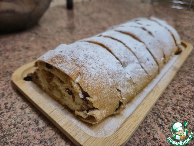 Рецепт, который обязательно надо попробовать. Я взяла его на сайте https://www.oetker.d e/rezepte/r/mandelst rudel. Пекла уже дважды. Это первый рецепт штруделя в моем исполнении. Я смотрела на другие рецепты штруделей, хотелось приготовить, но всегда боялась, что тесто в середине рулета не пропечется, будет мокрым. Когда увидела этот рецепт, даже не вспомнила о своих страхах и приготовила. Девочки, это что-то! Тесто тоненькое и все отлично пропеклось, даже в самом центре. Светлые полоски - это нежное, воздушное дрожжевое тесто. Первый раз завернула один рулет, как в рецепте. Но с трудом уместила его по диагонали на мой противень. Поэтому второй раз из этого количества продуктов приготовила два рулета.