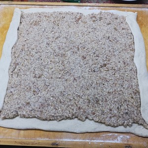 Обомните тесто на слегка посыпанной мукой рабочей поверхности и раскатайте в прямоугольник (40 х 30 см). Сверху равномерно распределите начинку, оставив края свободными примерно 2 см и загнув их внутрь.