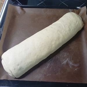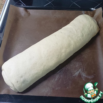Сверните тесто с длинной стороны. Выложите штрудель на противень и оставьте еще 20 мин.