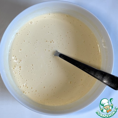 Добавить просеянную муку, венчиком хорошо перемешать, чтобы не было комков. Тесто получается жидким, чуть гуще, чем на блины.