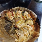 Разрезаю рыбу по спинке, разворачиваю, делаю много насечек, добавляю острые специи с томатом...