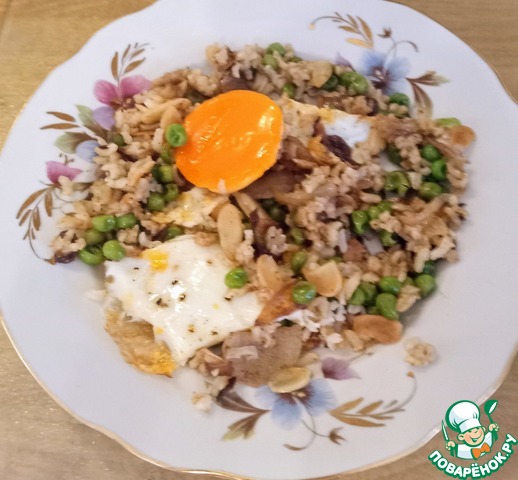можно добавить немного сливочного масла. В отдельной ёмкости зажарить яйца. Выложить их на рисовую смесь. Разложить по блюдам. Можно подавать. Приятного аппетита.