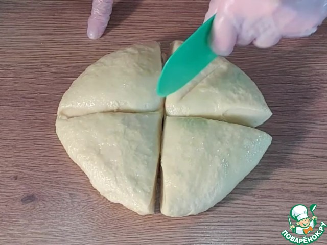 9. Тесто отлежалось, стало мягкое и пластичное, формируем из него лепешку, Ф=16-18 см. Делим лепешку вначале на 4 части.