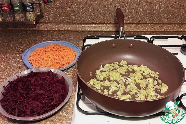 Свеклу и морковь натереть на терке. Лук и чеснок мелко порезать, обжарить в глубоком сотейнике на масле до прозрачности -