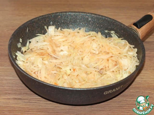 4. Приготовим начинку. Обжариваем лук на растительном масле до золотистости, минуты 3. Добавляем в сковороду мелко нарезанную капусту, приправу и специи.
