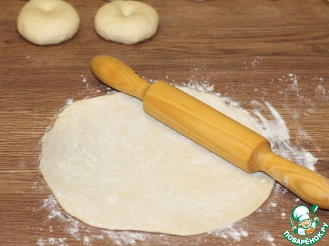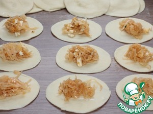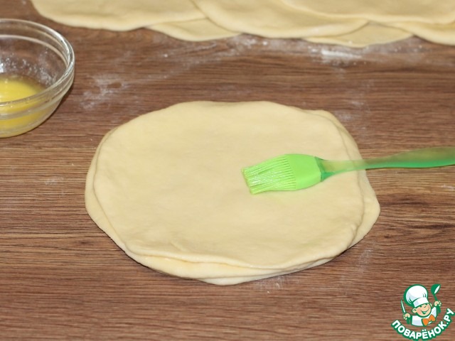 16. Раскатываем каждую заготовку в круг, Ф=10 см и раскладываем начинку.