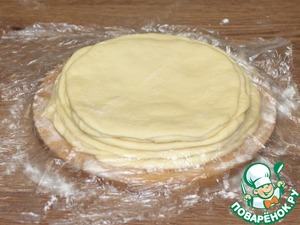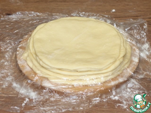 12. Подпыляем разделочную доску мукой и раскатываем каждую стопку в пласт, толщиной 2 мм.