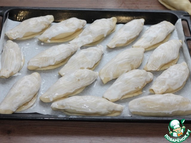 17. Формируем пирожки. Застилаем противень пекарской бумагой и смазываем маслом (растительным или холодным сливочным). Раскладываем заготовки пирожков и смазываем жидкой сметаной. Ставим противень в теплое место для расстойки пирожков, минут на 20.