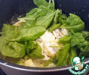 Варить лук-порей 3 минуты. Посыпать перцем. Добавить шпинат, пикшу копченую и треску. Продолжаем готовить ещё минуту до сворачивания шпината.