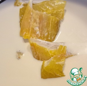 - Филе рыбное (копченая пикша, нарезанная на кусочки среднего размера. Можно заменить любой копчёной рыбой из семейства тресковых.) — 400 г