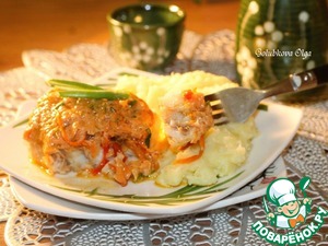 Минтай с зажаркой из овощей и политый соусом, запекают в духовке. Получается очень сочная, нежная и пряная рыба. На гарнир у меня картофельное пюре.