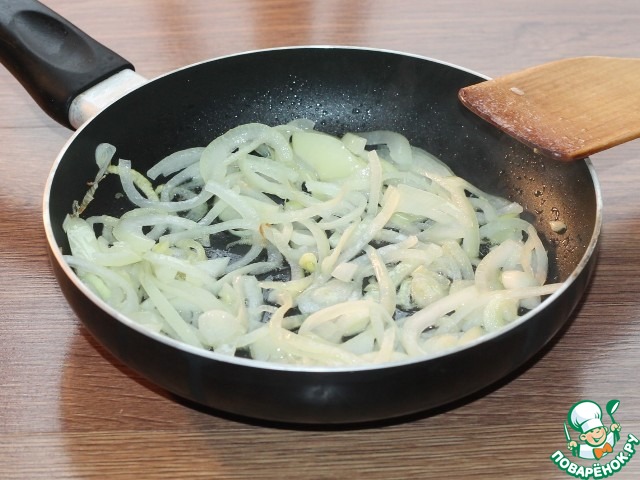 7. Пока варится картофель, приготовим зажарку. На разогретом растительном масле (2 ст. л.) обжариваем лук до "золотистости".