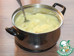 12. Добавляем в картофель сливочное масло (50 г) и теплое молоко (100 мл). Пробуем на соль. Измельчаем картофель до однородности.