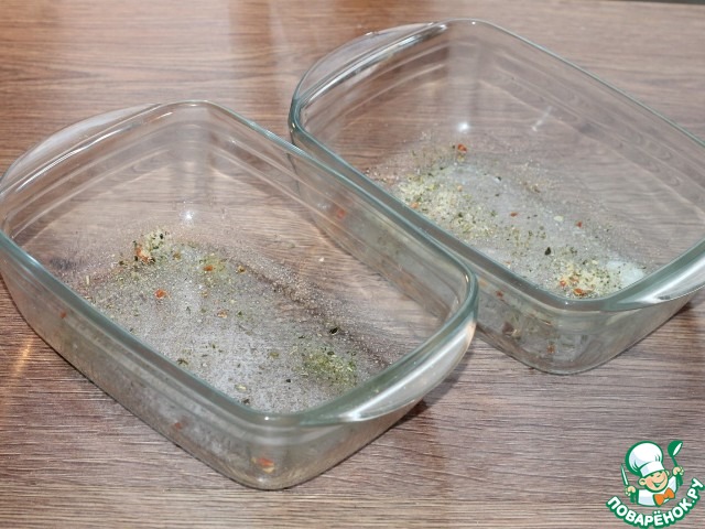 13. Формы для запекания (14*18 см), смазываем растительным маслом и посыпаем приправой для рыбы. Приправа с добавлением соли.