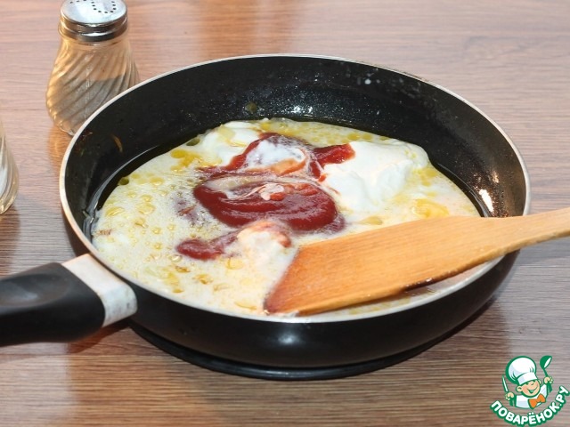 16. Приготовим заливку - соус. В сковороду, где была зажарка наливаем 100 мл картофельного отвара. Добавляем 2 ст. л. сметаны, 2 ст. л. томатного кетчупа, щепотку сахара, соль и молотый перец, перемешиваем лопаткой.