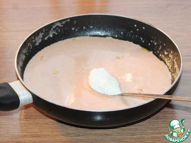 17. Ставим сковороду на огонь и всыпаем 1 ч. л. муки. Перемешиваем соус до небольшого загустения.