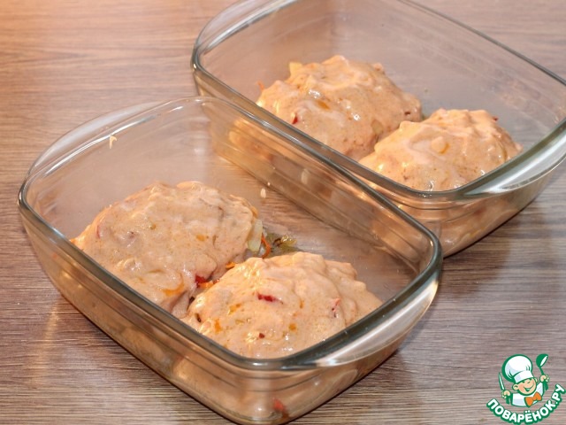 Прикрываем формочки фольгой или пергаментом и ставим в разогретую до 180 С духовку. Готовим минут 45 или до готовности рыбы.