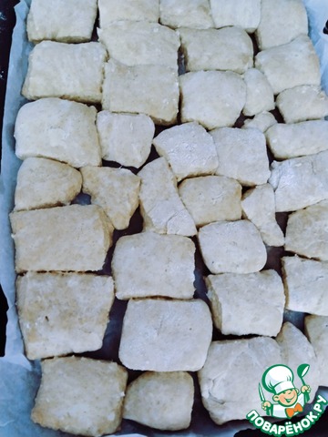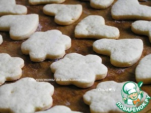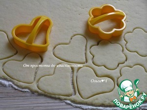Тесто раскатайте, чуть присыпав поверхность мукой, вырежьте любые фигурки, переложите на противень.