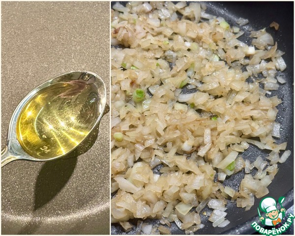 На нагреве «ниже среднего», постоянно помешивая, довожу до предпрозрачности. Умягчаю и выпариваю резкий луковый аромат.