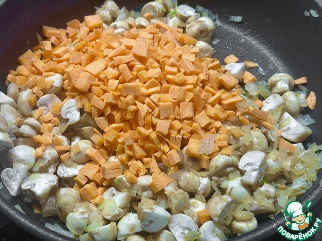 Немного прогрел. Буквально пару минут и мелко нарезанную морковку тоже в сковороду отправил.