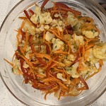 Через 3 минуты перемешайте и еще 3 минуты дайте, чтобы у нас цветная капуста более равномерно приготовилась. На специальной терке я натерла морковь, добавила щепотку соли и немного помяла рукой, чтобы морковь впустила сок и стала более эластичной и мягкой.