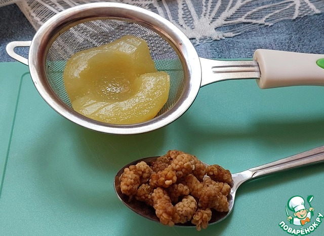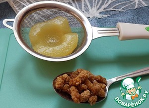 • Половинку груши откинуть на сито для удаления излишек сиропа, у шелковицы оборвать хвостики, промыть и обсушить на бумажном полотенце или в сите. У меня мягкая шелковица, предварительное замачивание не потребовалось. Если ягоды пересушенные, имеет смысл залить их перед употреблением кипятком минут на 5-10 (до размягчения).