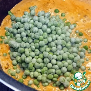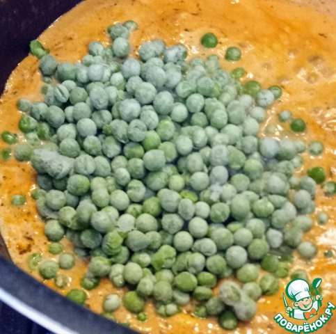 Добавьте зелёный горошек и продолжайте варить ещё 5 минут.