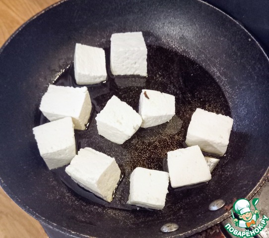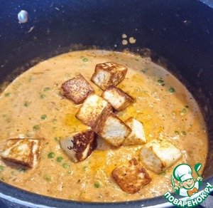 Тем временем, в сковороде разогреть оставшееся масло и жарить панир по 2-3 минуты с каждой из 4-х сторон до коричневого цвета.