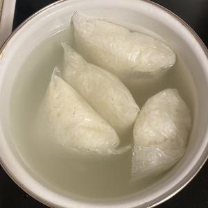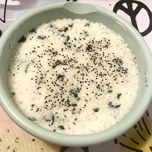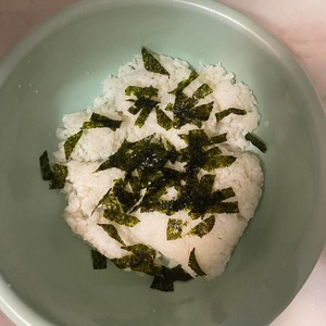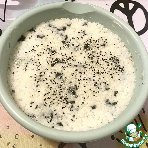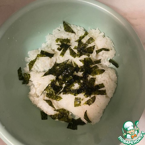 Подождите, пока рис остынет. Если вы используете порционный рис в пакетиках, залейте его холодной водой, затем подождите пять минут и слейте воду. Повторите три раза. Затем выложите половину охлажденного риса в большую миску. Далее порежьте нори на небольшие полоски, добавьте его в рис и перемешайте.