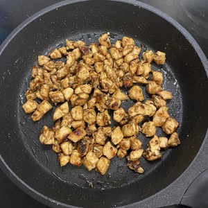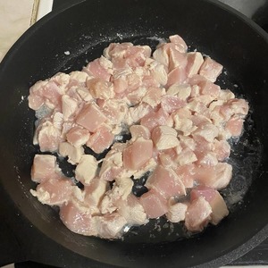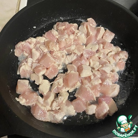Порежьте курицу на кубики, обжарьте её до готовности.