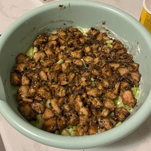 После того, как курица приготовилась, добавьте в неё соус терияки и обжарьте ещё несколько минут до карамелизации.