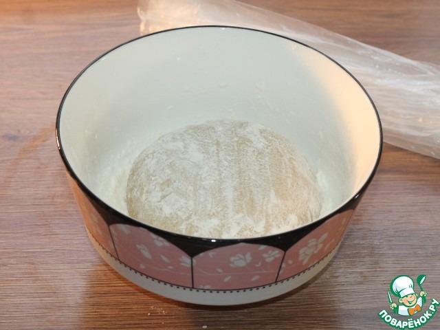 5. Миску немного припылить мукой и выложить тесто. Закрыть миску пленкой или прозрачным пакетом и поставить в теплое место на 1-1,5 часа.