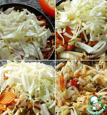 Далее добавляем капусту. Пекинская капуста очень прилично уменьшается в объеме и я её вмешиваю в три этапа: сначала добавляю треть капусты, перемешиваю, минутку жарю. Повторяю два раза. Но в принципе можно просто взять посуду большего размера.